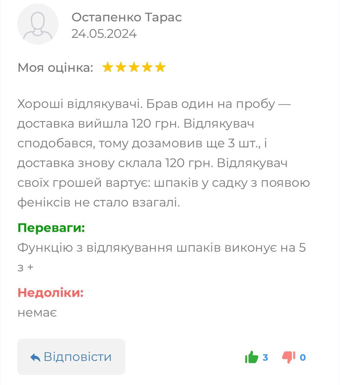 В нашому асортименті відлякувачі найкращої якості, за рахунок чого одного вистачає на 2-3 сезони користування